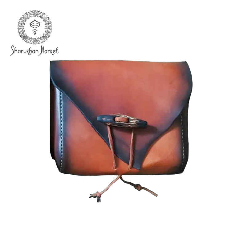Handmade leather waist bag with wooden clasp.